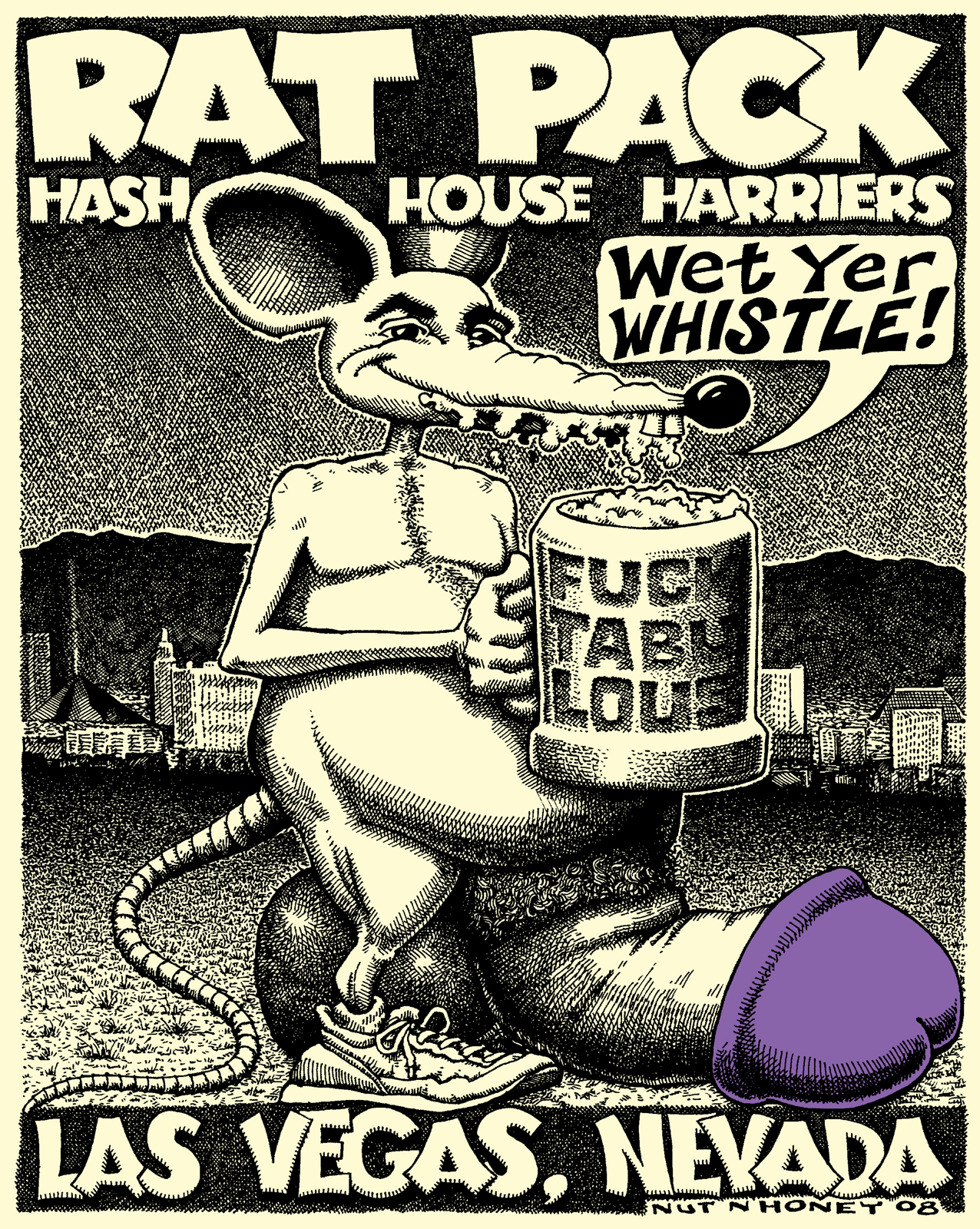 The Rat Pack HHH is the oldest semi-active Hash in the Las Vegas Valley. Since the great Sin City Hash Merger of 2002 , the Rat Pack has contributed to the Vegas Hash-scene by laying countless recovery r*ns, pub crawls, out of town trails, and two Vegas Hareline Standards – Have Shit Will Travels, world-famous, “New Years Day Hangover Hash” (1/1, half-mind), and the semi-annual “Dead Elvis Hash” (8/16, or whenever we get around to it, or not).